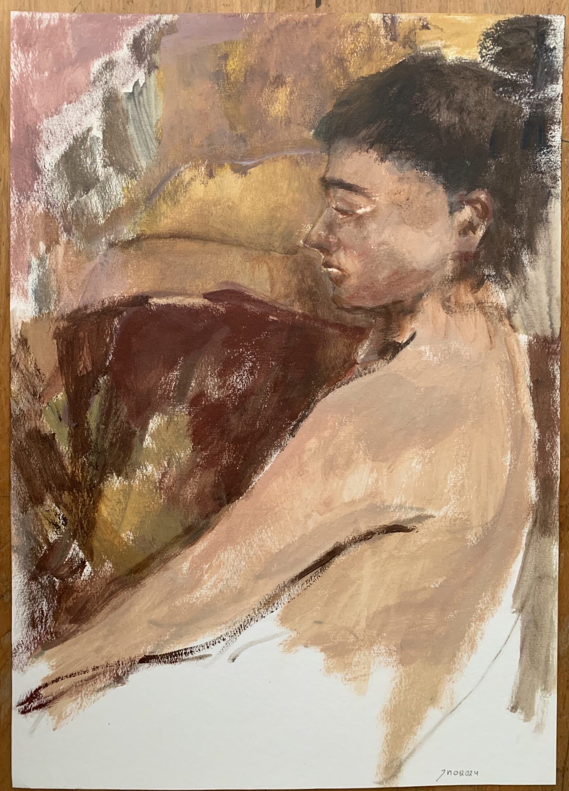 Vanaf 2014 werk ik in modelteken groepen. En modelwerk blijkt goed bij me te passen. Ik ontwikkelde al snel mijn handschrift, een lyrische lijn kwam naar boven. Het houtskoolwerk van die dagen evolueerde tot schilderen met aquarelverf. Model-schilderen verveelt mij nooit!