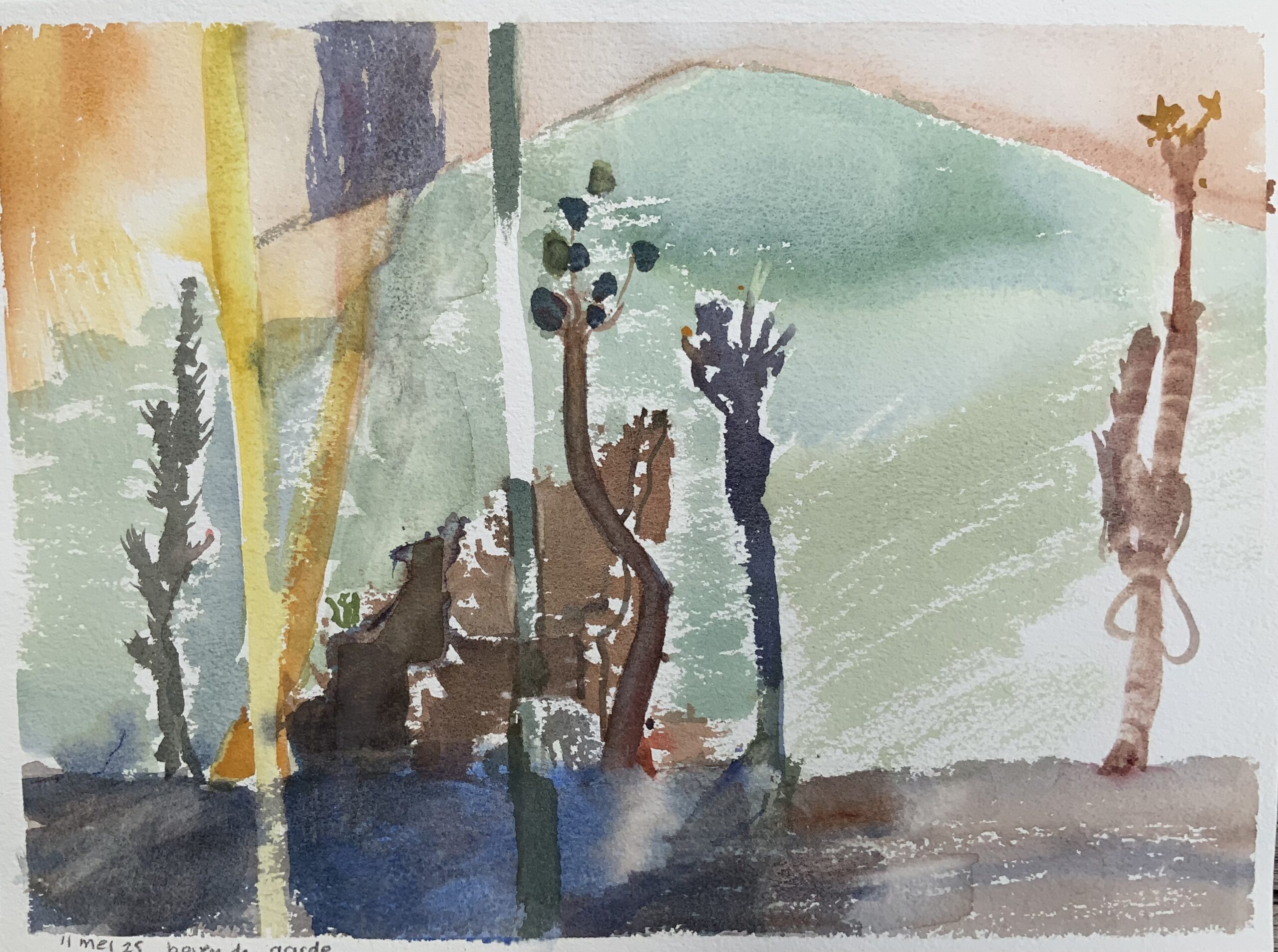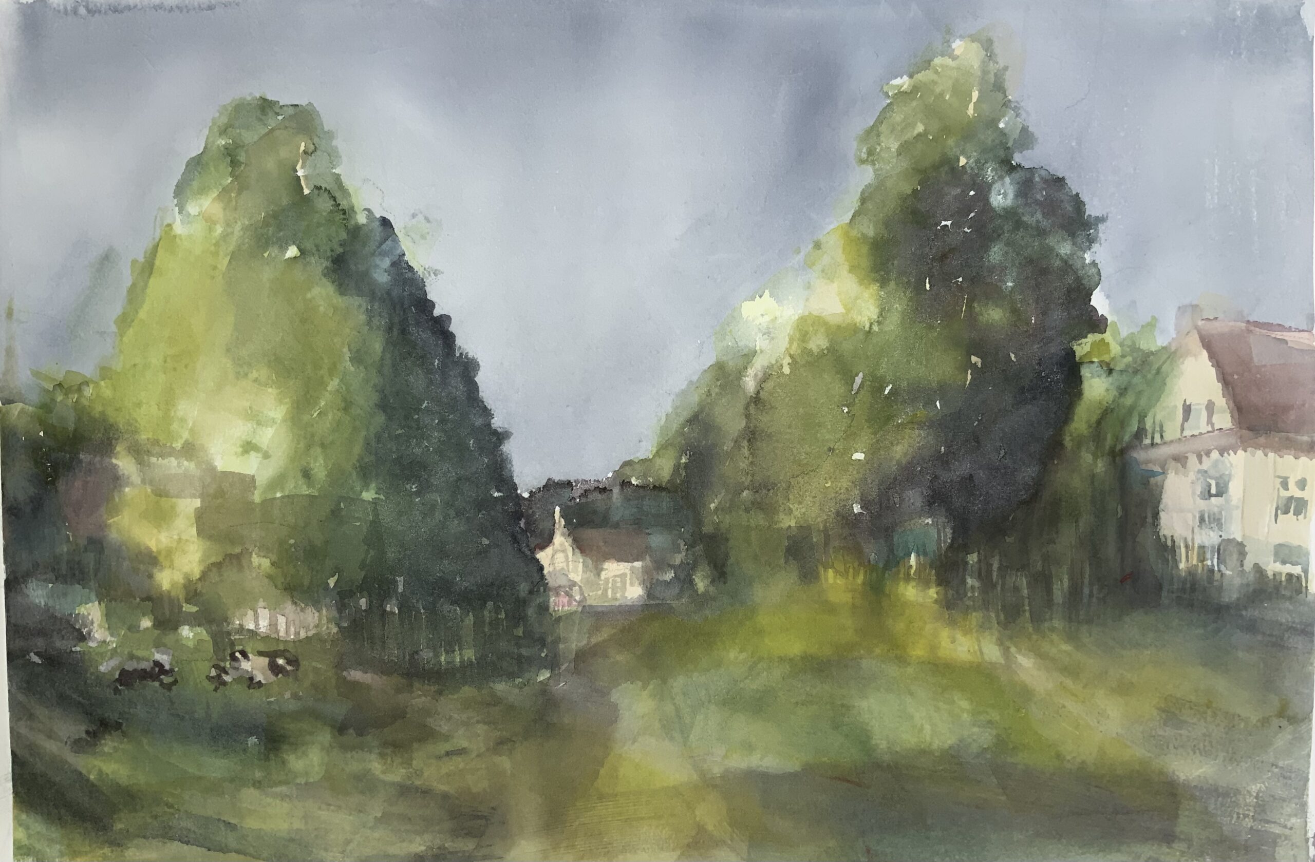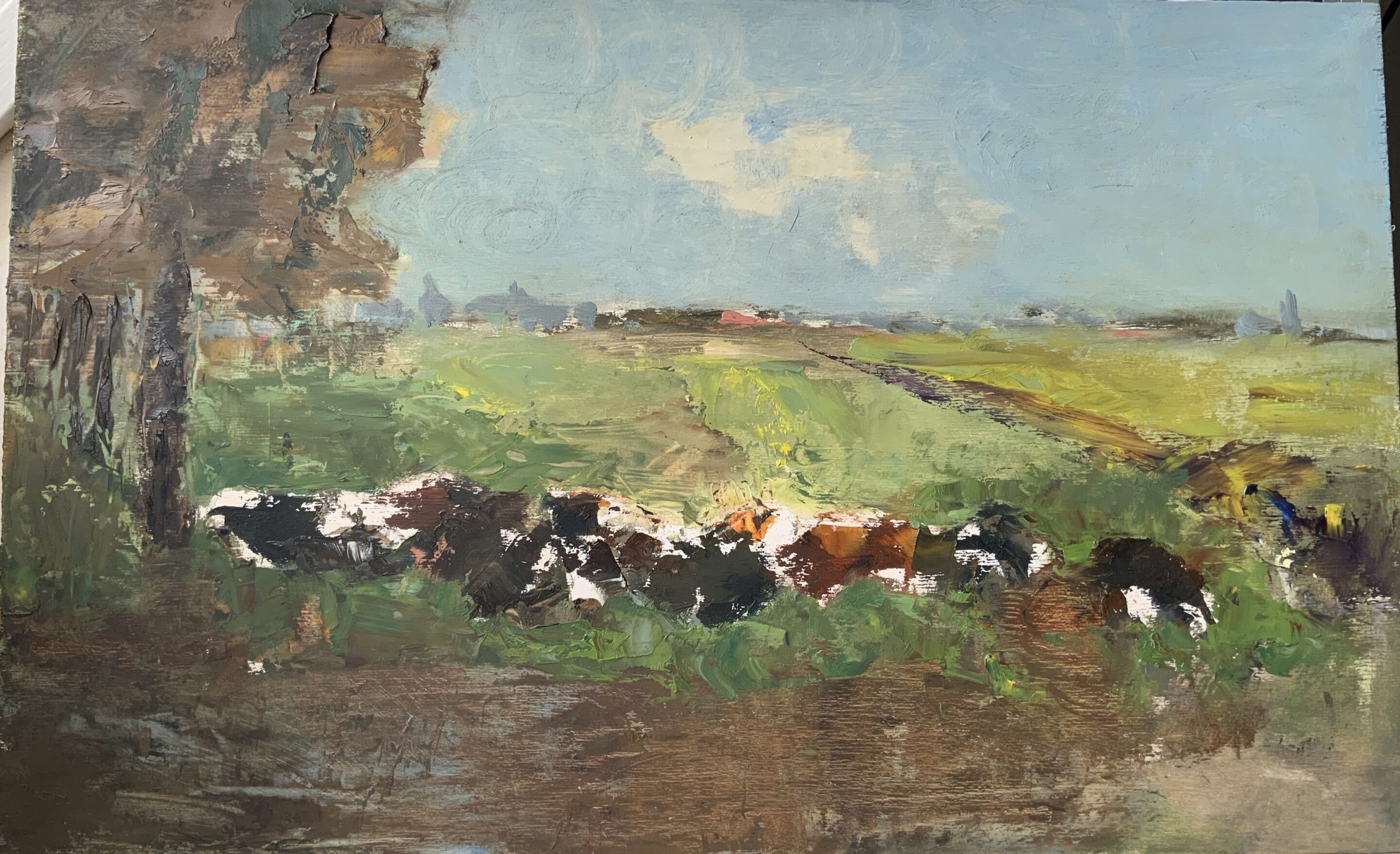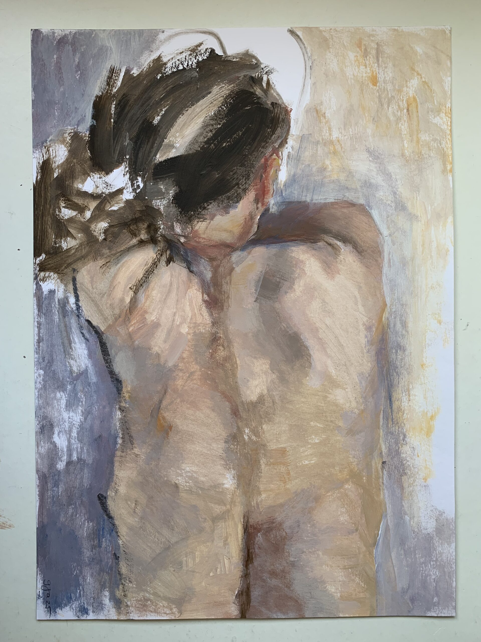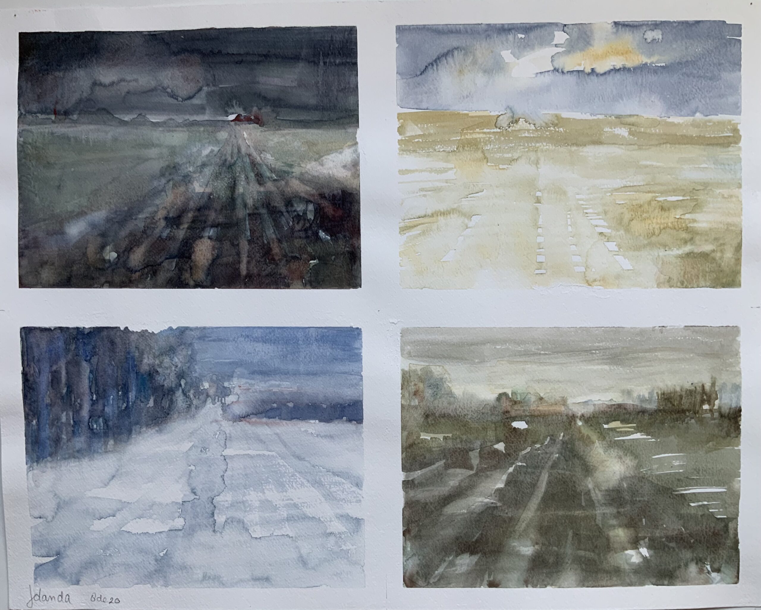 Sinds 2024 werk ik met acrylverf, voornamelijk omdat het praktisch is om het werk meteen droog mee te nemen in een reismap. De map is ook de reden dat het meeste van mijn werk een afmeting heeft van 40 cm bij 60cm.